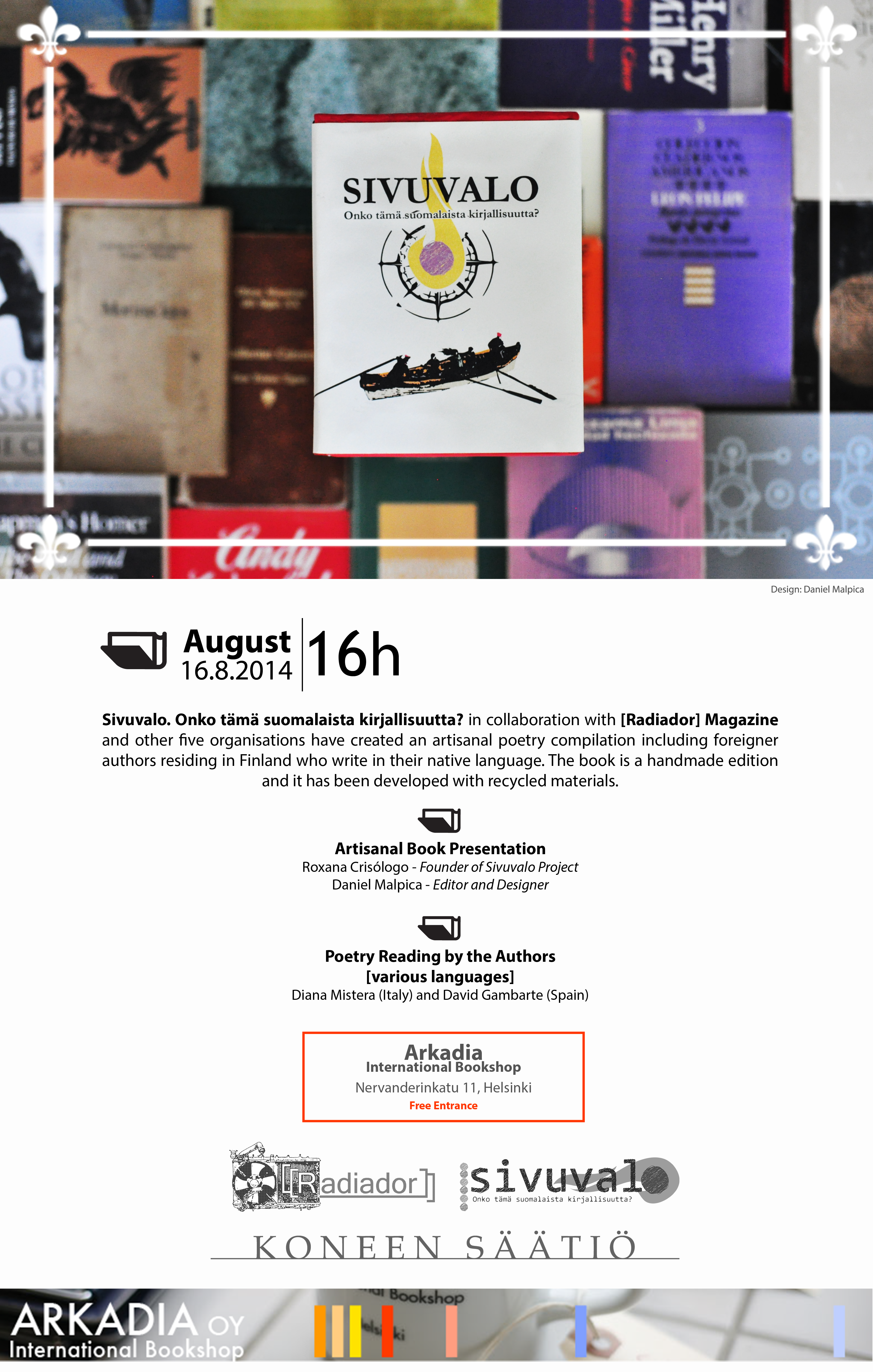 * Sivuvalo explores and faces those identities called transnationals. Speaking a different language, have a diverse identity should not be a barrier in a globalized world. This is a fact, immigrant authors living in Finland does not write in Finnish or Swedish, they continue creating in their mother tongues. This situation instead of being a problem should be regarded as an advantage that Finnish society could use in the best way. This first Sivuvalo book when show texts in different languages without translation wants to create awareness about the existence of that kind of literary work produced in Finland. This book is a complicated case of use of language that we deal with using creativity but also accepting the languages and identities of the Other.