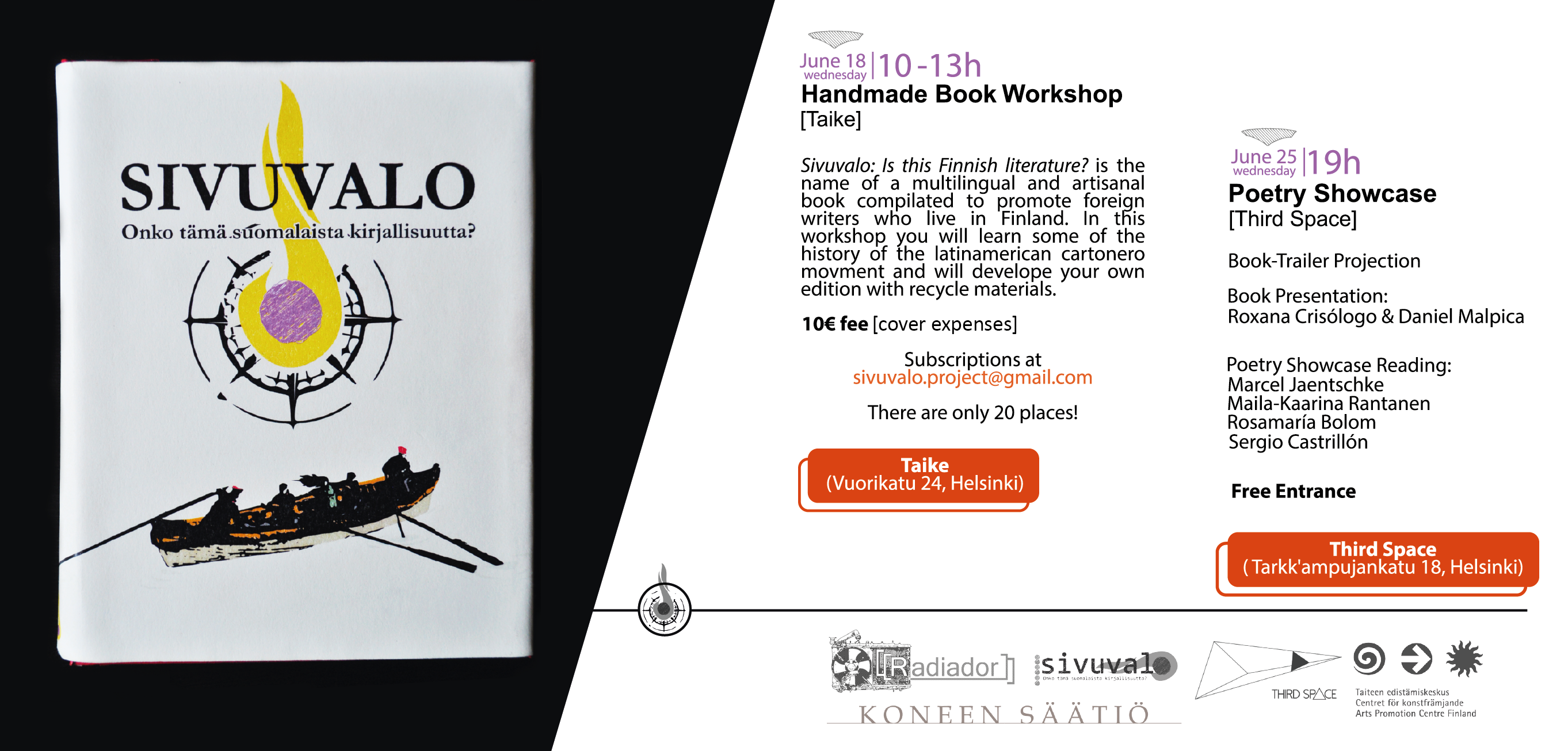 In 2014, Sivuvalo, in co-edition with [Radiador] Magazine and other five organizations, developed its first compilation with the work of trans-cultural writers based in Finland. The book was published in several languages as away to make clear the problematic of translation that authors with immigrant background have to deal. The book includes authors from Peru, Italy, Mexico, Spain, Nicaragua, Russia, Basil, Somalia and Finland.