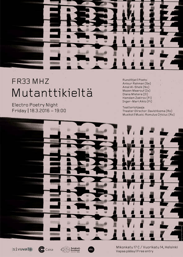 FR33MHz – MUTANTTIKIELTÄ was an Electro-Poetry Night where freedom and human rights are more current than ever before. The political changes in Finland as well as the financial and humanitarian crises are pushing people to the extremes. So we have to stick together and not let hatred, violence and extremism win. Language itself might be our best ally. The event will focused on transcultural and multilingual poets and writers living in the Nordic countries and writing in their mother tongue.