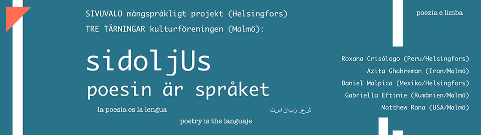 I Malmö har kulturföreningen Tre Tärningar (3T) nyligen skapats av poeterna Lalo Barrubia, Azita Ghahreman och översättare Petronella Zetterlund med syftet att arbeta för att ALLA i Malmö ska kunna vara delaktiga i och uttrycka sig med hjälp av litteraturen oavsett kulturell och språklig bakgrund. 3T förespråkar och jobbar aktivt med översättningar för poeter och författare bosatta i Malmö och Sverige som skriver på andra språk än svenska. SIDOLJUS. Poesin är språket är ett sätt att uppmärksamma detta och starta ett samtal om litteraturens villkor och språkens möjligheter. Inbjudna är poeterna Roxana Crisólogo (Peru) och Daniel Malpica (Mexiko), projektledare respektive producent för Sivuvalo-projektet i Helsingfors som under två år har arbetat med samma frågor i Finland.
