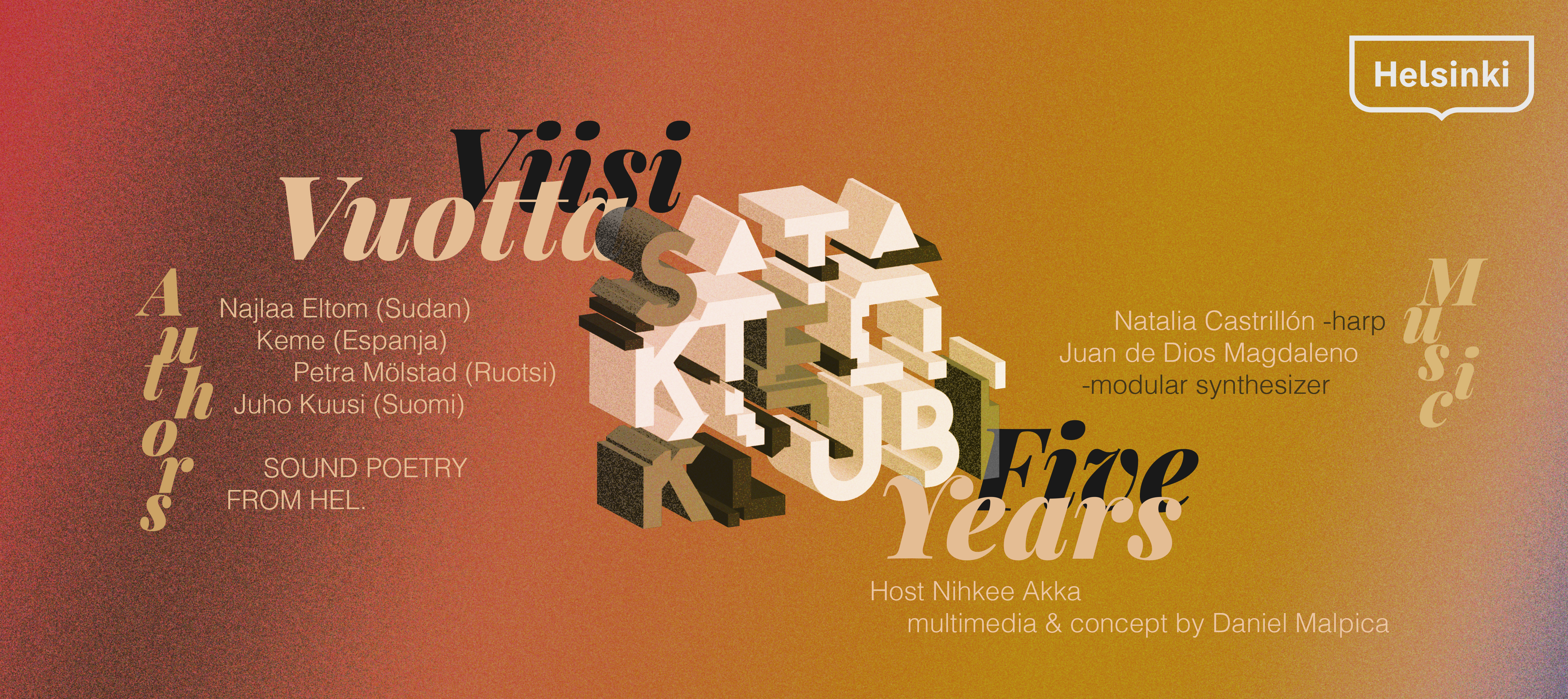 Satakieliklubi is celebrating its 5th anniversary! The event is a multimedia literature night that introduces and highlights international literature and translation in dialogue with sound art and design.