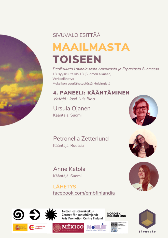 Maailmasta toiseen kirjallisuusfestivaali: Kääntäminen sivuvaloSeptember 10, 2020April 7, 2022Maailmasta toiseen 2020 Post navigation PreviousNext (español) (english) Share this: Click to share on X (Opens in new window) X Click to share on Facebook (Opens in new window) Facebook More Click to email a link to a friend (Opens in new window) Email Click to print (Opens in new window) Print Like Loading... Related