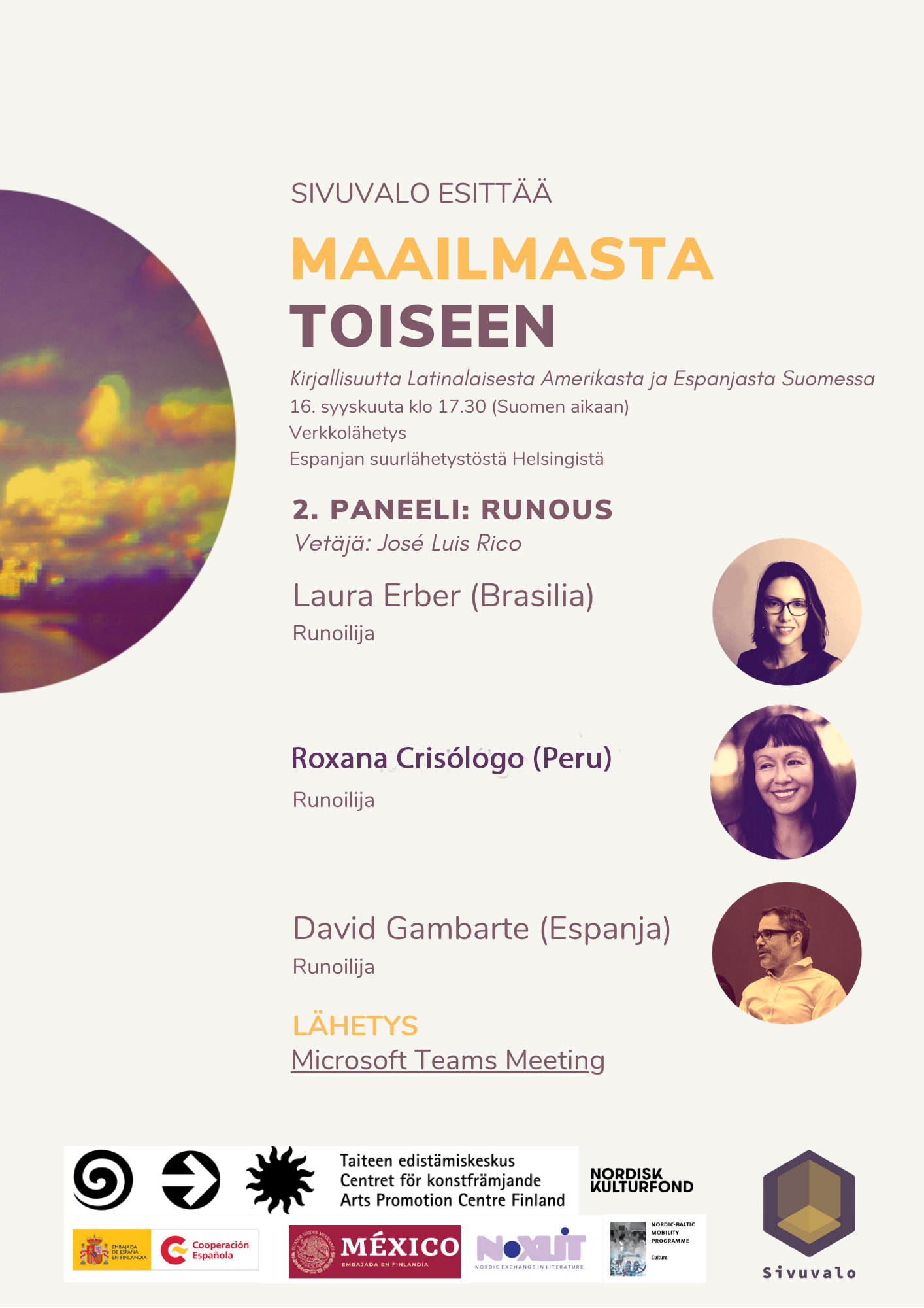Maailmasta toiseen kirjallisuusfestivaali: Runous sivuvaloSeptember 10, 2020April 7, 2022Maailmasta toiseen 2020 Post navigation PreviousNext (español) (english) Share this: Click to share on X (Opens in new window) X Click to share on Facebook (Opens in new window) Facebook More Click to email a link to a friend (Opens in new window) Email Click to print (Opens in new window) Print Like Loading... Related