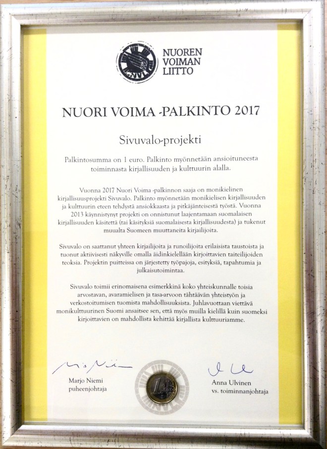 Vuonna 2017 Nuori Voima -palkinnon saaja on monikielinen kirjallisuusprojekti Sivuvalo. Palkinto myönnetään monikielisen kirjallisuuden ja kulttuurin eteen tehdystä ansiokkaasta ja pitkäjänteisestä työstä. Vuonna 2013 käynnistynyt projekti on onnistunut laajentamaan suomalaisen kirjallisuuden käsitettä (tai käsityksiä suomalaisesta kirjallisuudesta) ja tukenut muualta Suomeen muuttaneita kirjailijoita.