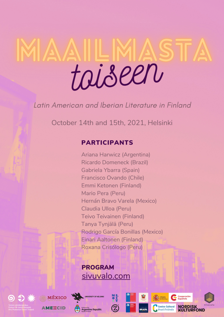 Maailmasta toiseen is a literary festival in Spanish, Portuguese, and Finnish. Curated by Roxana Crisólogo and José Luis Rico, the festival’s purpose is to address the literary and cultural dimensions of the Spanish and Portuguese-speaking world, and to offer the Finnish public a fresh perspective of these facets and changes. The current edition will take place on October 14th and 15th, 2021, hosted by the University of Helsinki and Rosebud Bookstore’s downtown branch.