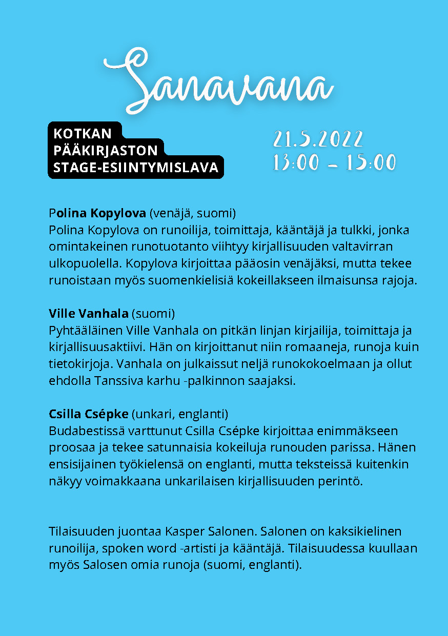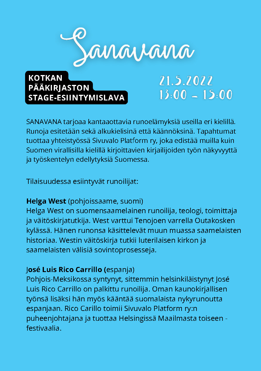SANAVANA tarjoaa kantaaottavia runoelämyksiä useilla eri kielillä. Runoja esitetään sekä alkukielisinä että käännöksinä. Tapahtumattuottaa yhteistyössä Sivuvalo Platform ry, joka edistää muilla kuinSuomen virallisilla kielillä kirjoittavien kirjailijoiden työn näkyvyyttäja työskentelyn edellytyksiä Suomessa.