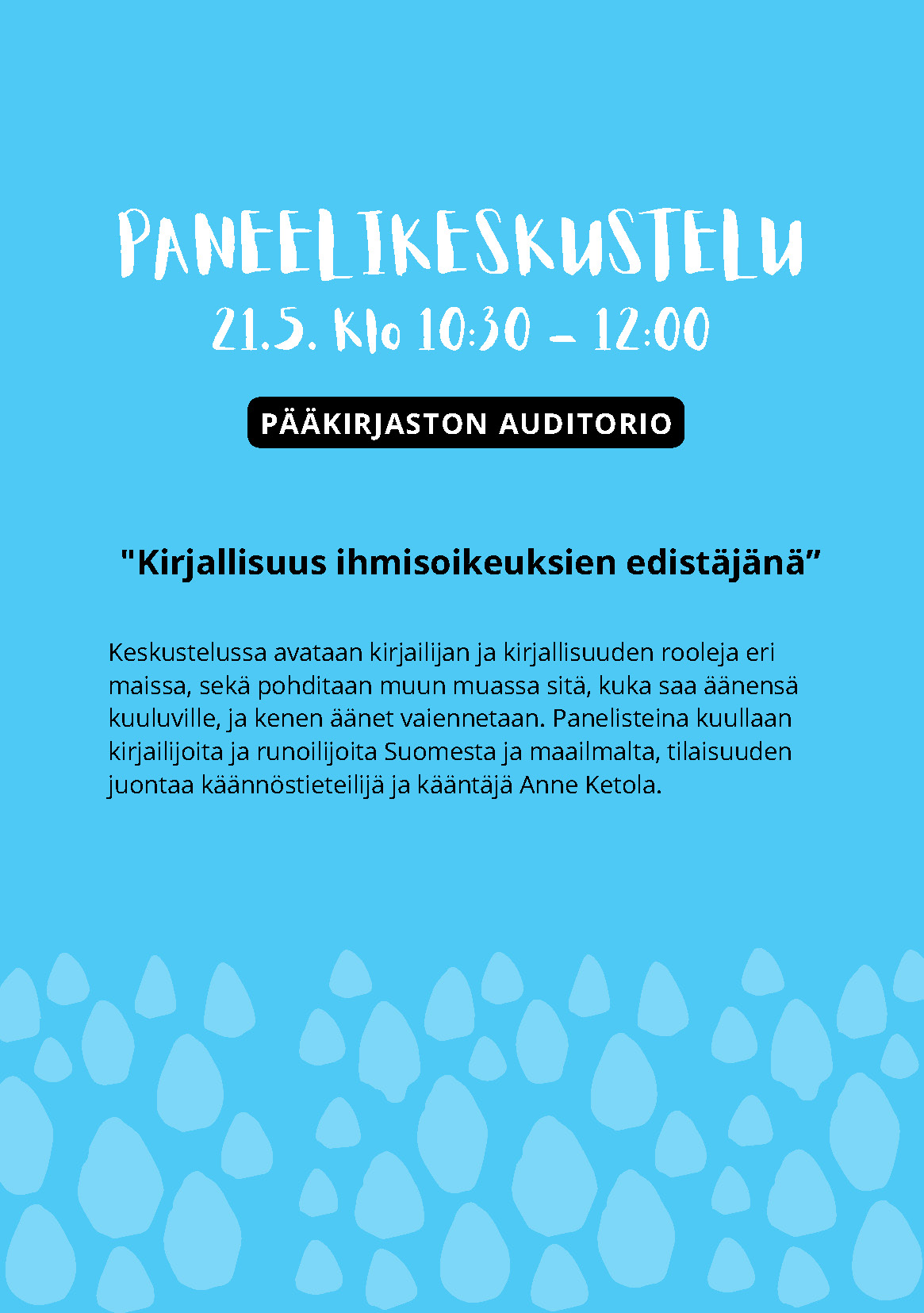 Tilaisuudessa esiintyvät runoilijat: José Luis Rico Carrillo, Csilla Csépke, Kasper Salonen, Ville Vanhala, Polina Kopylova, Helga West ja kääntäjä Anne Ketola.