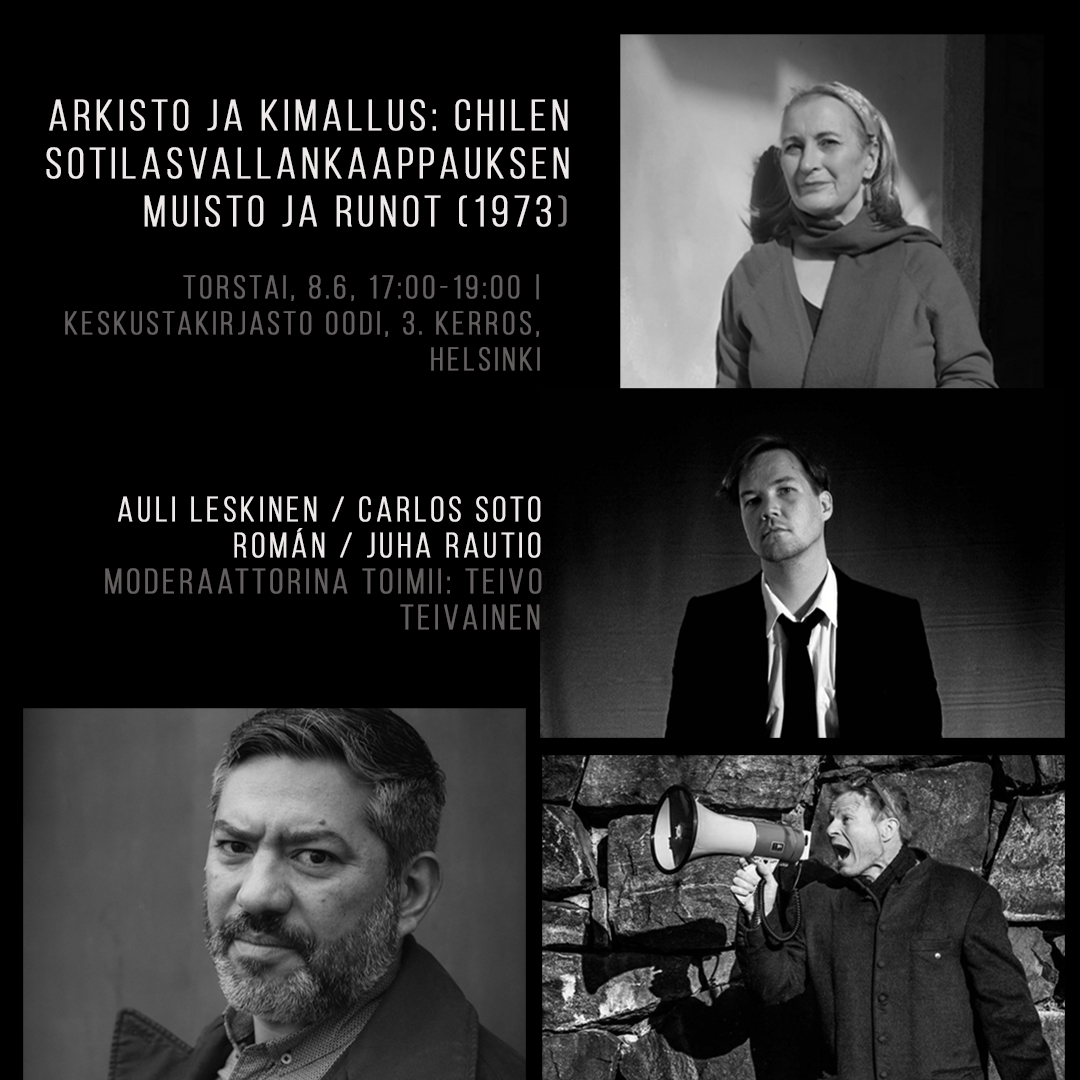 Osallistujat: Latinalaiseen Amerikkaan erikoistunut kirjailija Auli Leskinen, vieras runoilija Carlos Soto Román, runoilija Juha Rautio ja Chile 50
