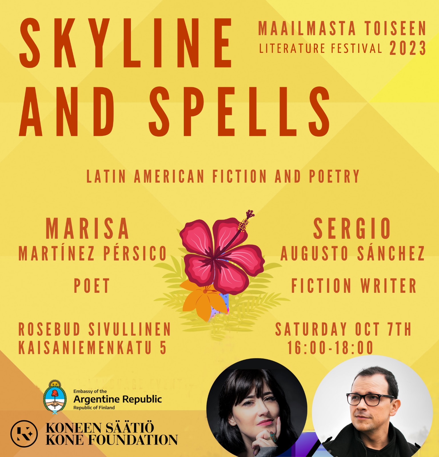 Latinalaisamerikkalaisen kirjallisuuden kirjo on runsas ja monipuolinen. Maagisesta realismista tunnustuksellisuuteen, kielirunoudesta posthumanismiin, koulukunnat ja virtaukset ruokkivat viidentoista maiden laajuista liikehdintää. Argentiinalainen runoilija Marisa Martínez Périsco (1978) esittää otteita hänen hiljattaisesta Finlandia-nimisestä runokokoelmastansa. Suomessa asuva kolumbialainen romaanikirjailija Sergio Augusto Sánchez (1984) esittää hänen esikoisteoksensa Sade piiskaa asfalttia, Aviador Kustannuksen kustantamana vuonna 2021. Marisa Martínez Pérsico on käynyt Suomessa kirjailijaresidensseissä, josta hän sai innoituksensa kyseiseen kokoelmaan. Einari Aaltosen suomentamassa teoksessaan Sergio Sánchez tuo lukijoiden ulottuville nyky-Kolumbian maaseudun ja kaupunkien juurettomien ihmisten kohtalot. Osallistujat kommentoivat omien tuotantonsa pääpiirteitä, niiden yhteyttä espanjankieliseen kirjallisuuteen, ja heidän suhteensa pohjoiseurooppalaiseen kulttuuriin. Tilaisuudessa luetaan teosten otteiden suomennoksia.