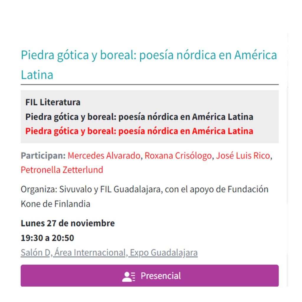 Kääntäjät ja kirjailijat Petronella Zetterlund, Mercedes Alvarado, Roxana Crisólogo ja José Luis Rico keskustelevat kokemuksistaan siltojen rakentamisessa Norjan, Suomen, Ruotsin ja Latinalaisen Amerikan välille. Osallistujat lukevat näytteitä espanjankielisistä käännösprojekteistaan.