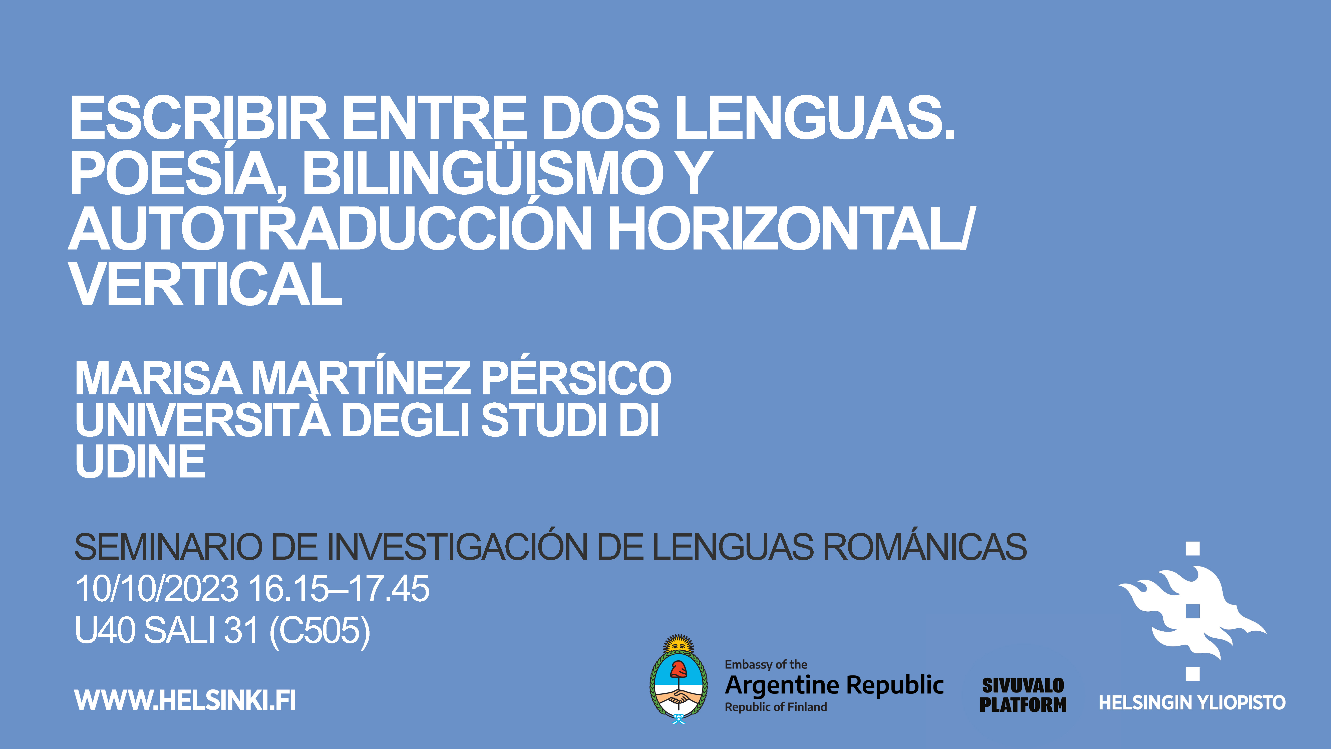 Professori Marisa Martinez Pérsico vierailee Suomeen osallistumaan Maailmasta toiseen -kirjallisuusfestivaaliin. Helsingin yliopisto järjestää hänen kanssa espanjankielinen keskustelu “Escribir entre dos lenguas. Poesía, bilingüismo y autotraducción horizontal / vertical” U40 Sali 31 [ C505] Metsätalossa.