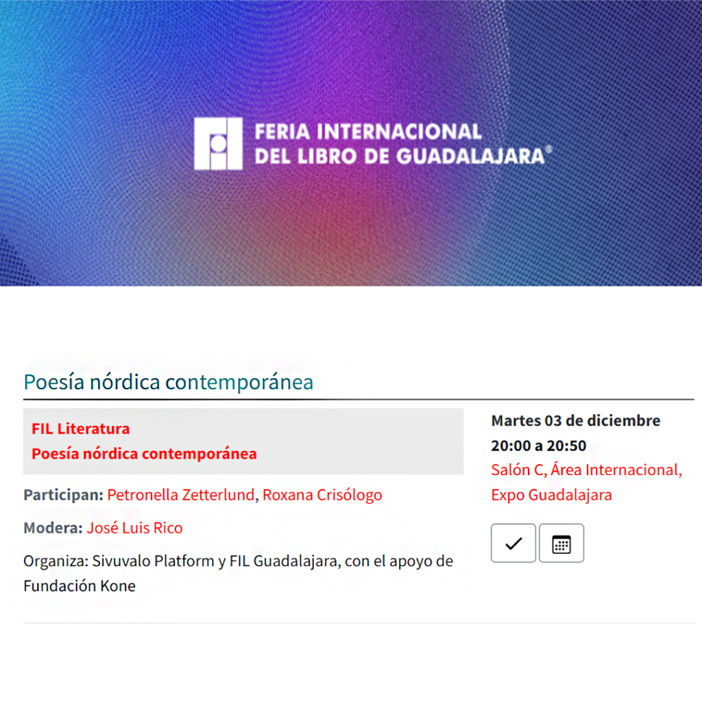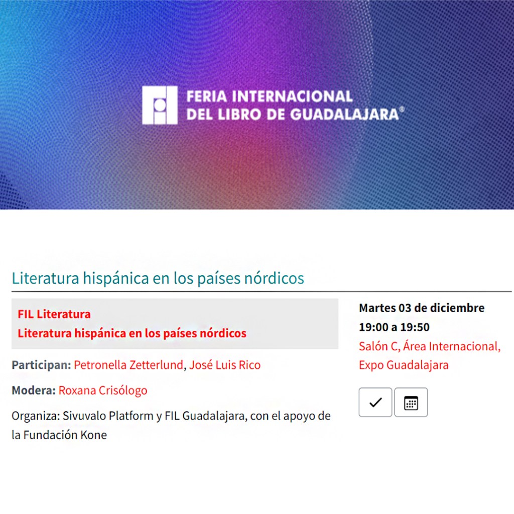 Paneeleiin osallistuvat Sivuvalosta José Luis Rico ja Roxana Crisólogo sekä ruotsalainen kääntäjä Petronella Zetterlund.