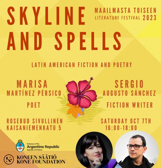 Argentinian poet Marisa Martínez Pérsico will present excerpts from her recent collection of poems Finlandia. Finnish-based Colombian novelist Sergio Augusto Sánchez will present his book Sade piiskaa asfalttia, published by Aviador Kustannus in 2021.